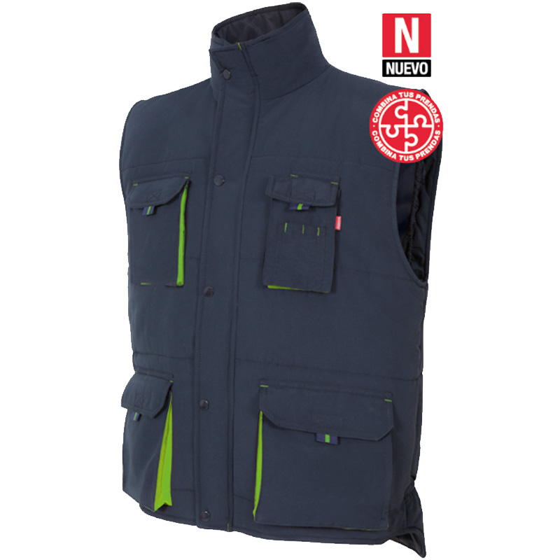 Chaleco con cierre de cremallera de nylon oculta y corchetes. Cuello alto. Sisas ajustables. Un bolso de pecho con cartera de velcro. Dos bolsos interiores de cremallera. Dos bolsos laterales con carteras de velcro. Acolchado. Combinado con alta visibilidad. Refuerzos de presillas. Elástico en cintura.