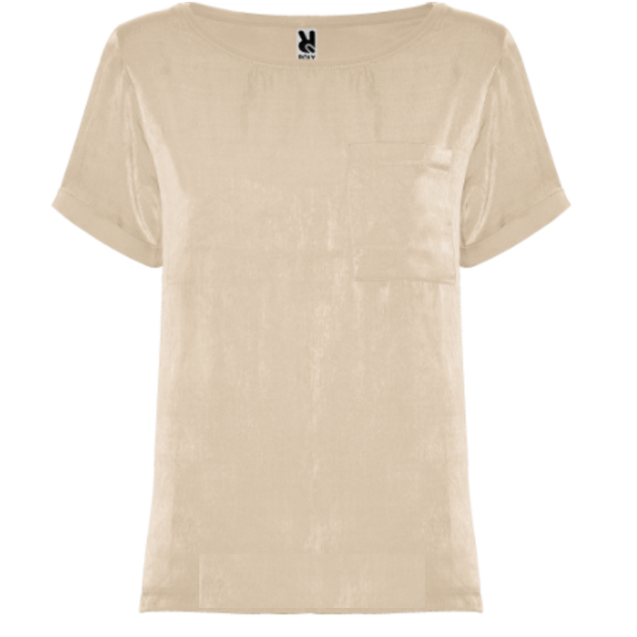 Camiseta de mujer de manga corta y escote amplio. Bolsillo en pecho izquierdo. El patronaje de la espalda es ligeramente más largo que el delantero, con aperturas laterales en el bajo. Tejido frontal satén y posterior algodón.