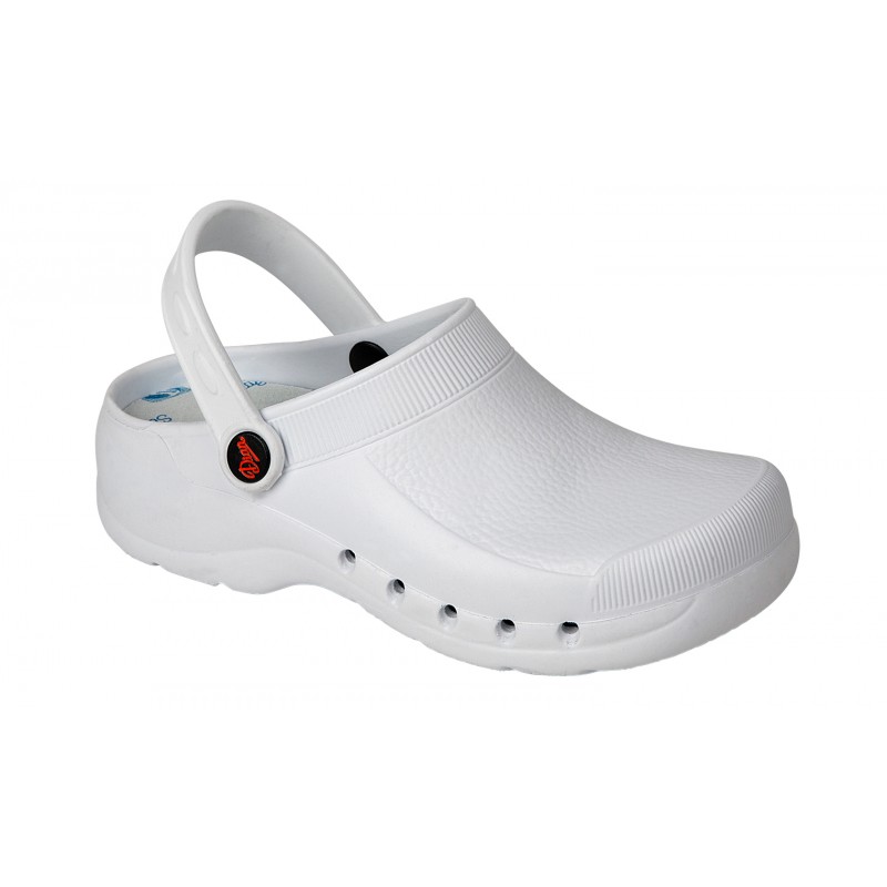Zueco ultraligero de EVA, libre de látex, monocasco, anatómico y antideslizante. Apto para lavado en lavadora hasta 40º. Con correa posterior abatible entre el talón y la pala, perforado en los laterales para facilitar la transpiración, la limpieza y evitar la penetración directa dentro del zueco de líquidos o fluidos.