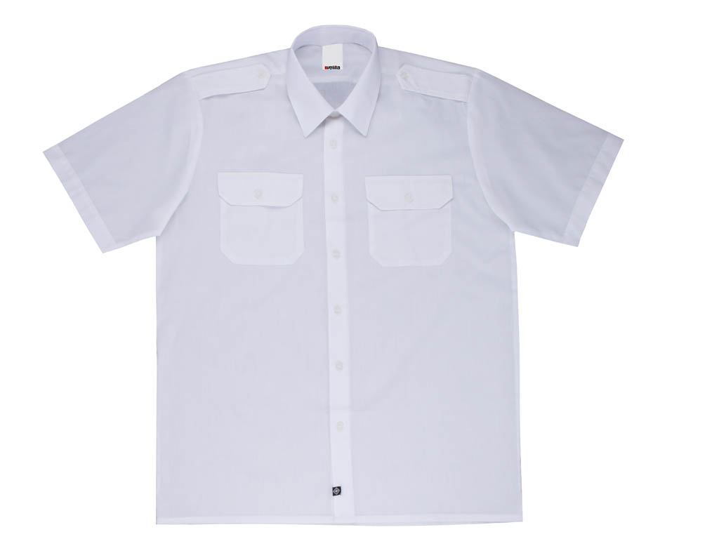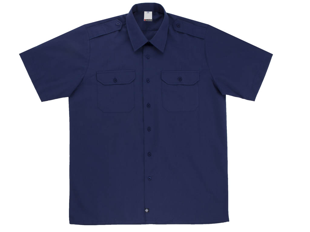 Camisa de manga corta. Cierre central con botones, dos bolsillos de parche en el pecho con tapeta y botón y galoneras con botón.