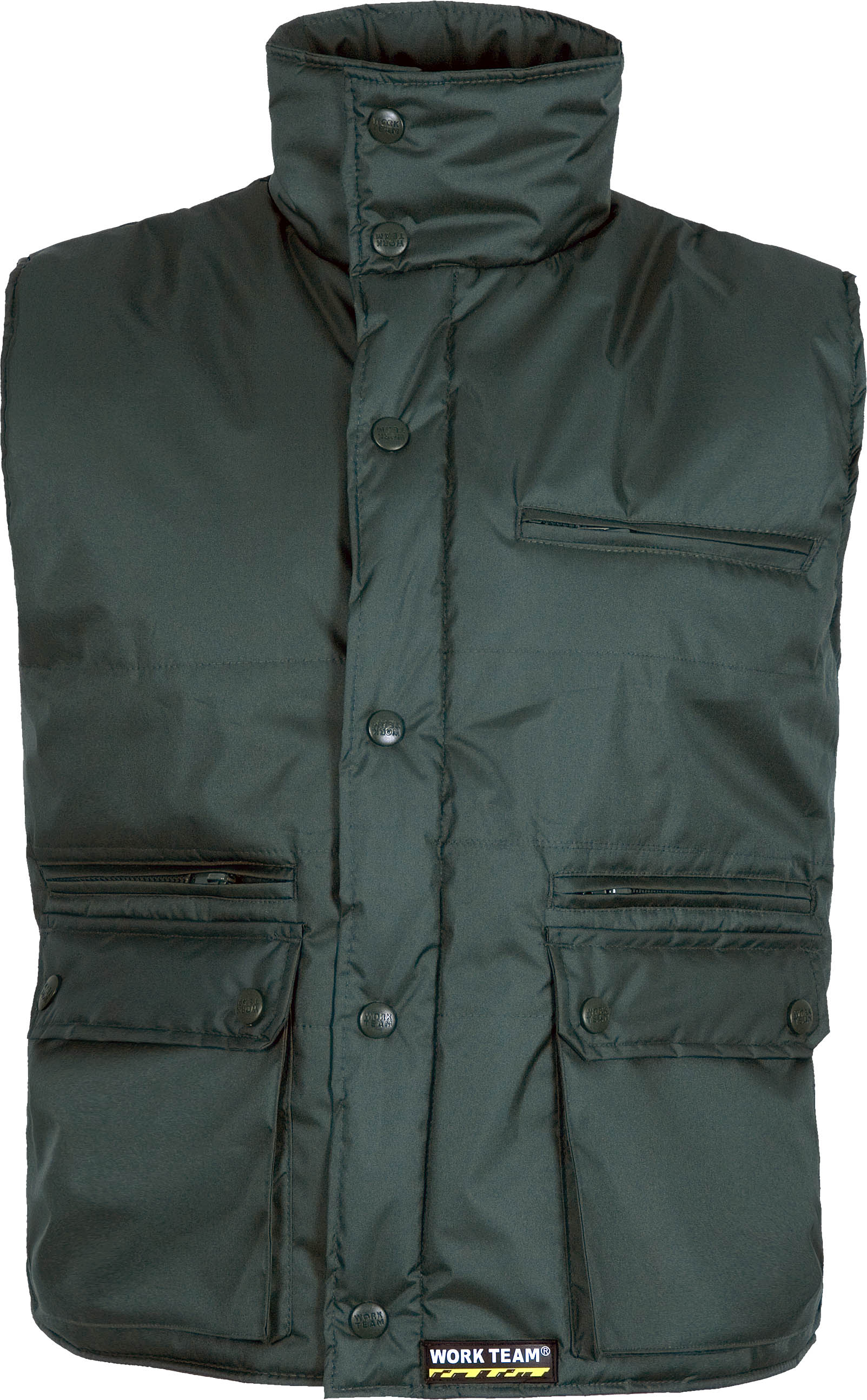 Chaleco con cierre de cremallera de nylon oculta y corchetes. Cuello alto. Un bolso de pecho interior con cremallera. Dos bolsos laterales interiores de cremallera. Dos bolsos laterales con carteras de corchete. Acolchado. Sisas ajustables. Elástico en cintura. Tejido Oxford.